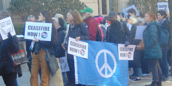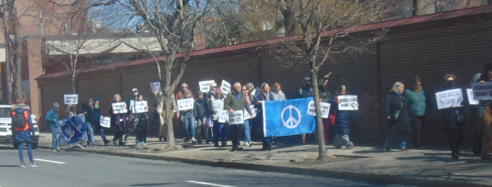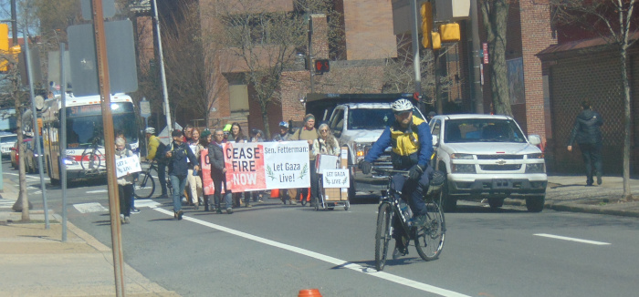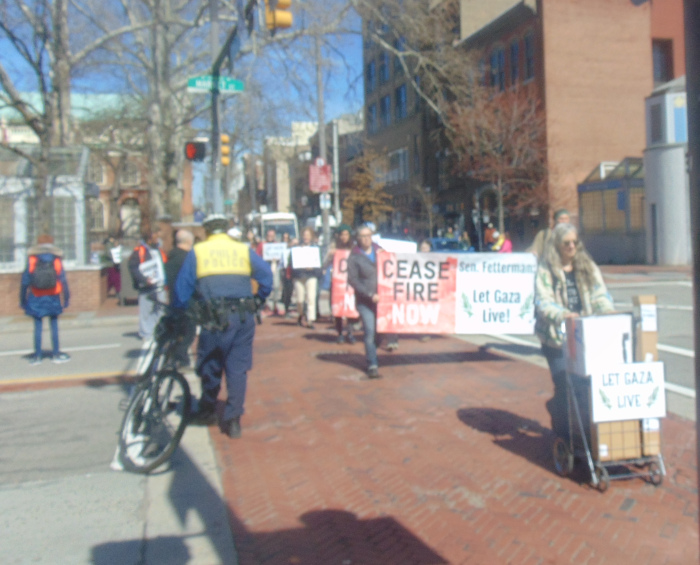 Fridays at Fetterman’s enhances its usual protests in front of Senator Fetterman’s office by adding a teach-in at the local Friends Center and by then making a march to his office. We boosted our usual attendaence by many times our usual number.