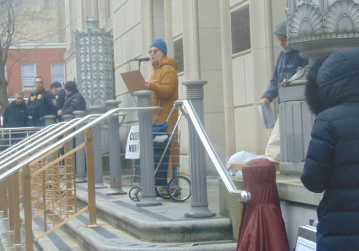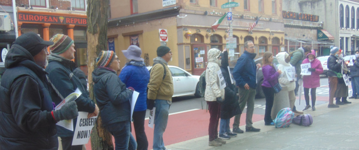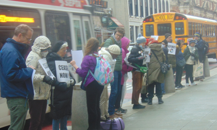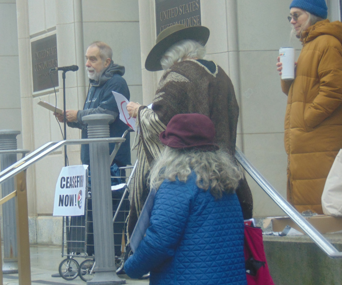 Our usual line in front of the office of Senator Fetterman (D-PA), protesting his position on Gaza. On his press release, his first paragraph is a good one. But the second paragraph, which speaks of the need to eliminate Hamas, really needs updating to acknowledge that Palestinian residents of Gaza are on the wrong side of what the International Court of Justice made an interim ruling on, that Israel needed to comply with six provisional measures designed to ensure that Israel was not committing genocide.