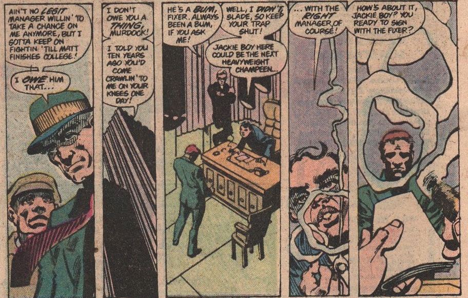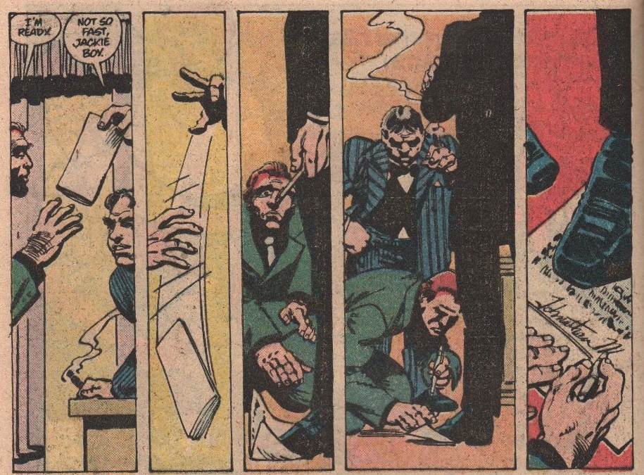 Here’s Frank Miller, an artist of the 80s, he doesn’t even need words for the last few pictures as Matt Murdoch’s (Daredevil’s) father is forced into signing a contract.