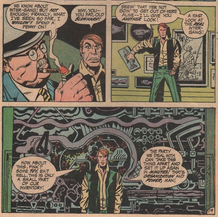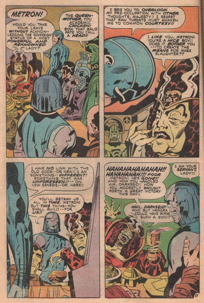 Here’s another scene from New Gods (1972), Darkseid’s body language is only mildly threatening, but Metron feels it best to do as he’s told. The Queen Mother is also a completely open book as far as her feelings go.