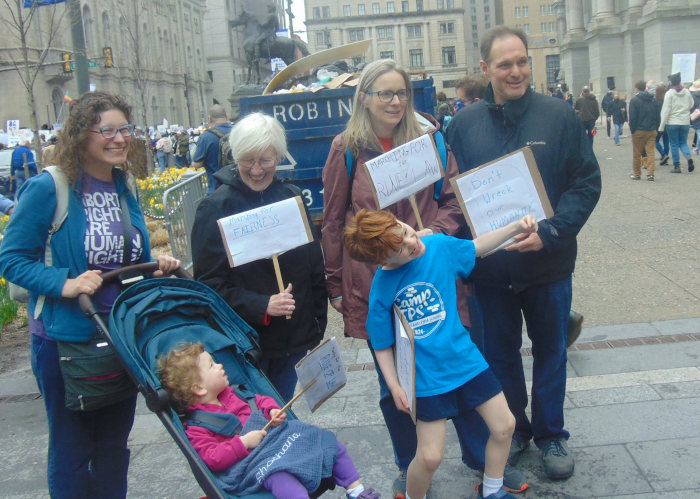 Family poses with signs.